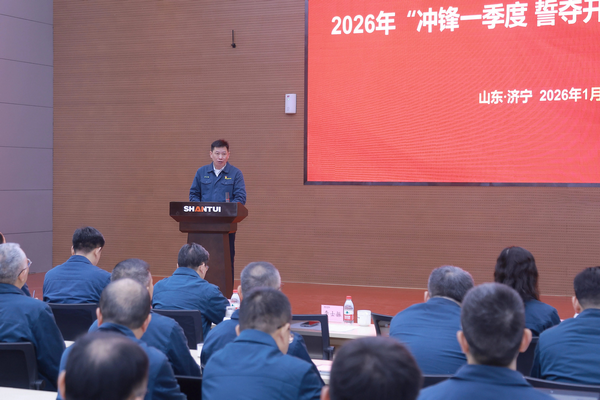 1月5日,山推召開2026年“沖鋒一季度 誓奪開門紅”動員大會,公司黨委書記、董事長李士振作動員講話,黨委副書記、總經理張民通報2026年“沖鋒一季度 誓奪開門紅”各單位經營指標,黨委副書記、工會主席馬景波主持大會。