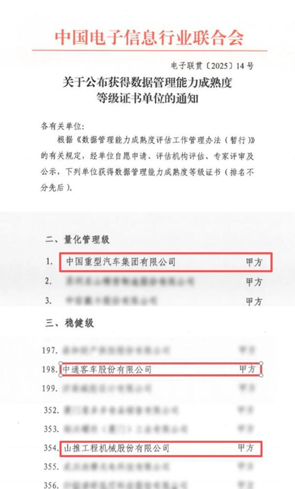 近日,由國家工業和信息化部指導,中國電子信息行業聯合會發布了《關于公布獲得數據管理能力成熟度等級證書單位的通知》,山東重工旗下中國重汽獲得國家數據管理能力成熟度“量化管理級”(4級)認證,山推股份與中通客車獲得“穩健級”(3級)認證,標志著集團數據管理能力總體處于制造業領先水平。