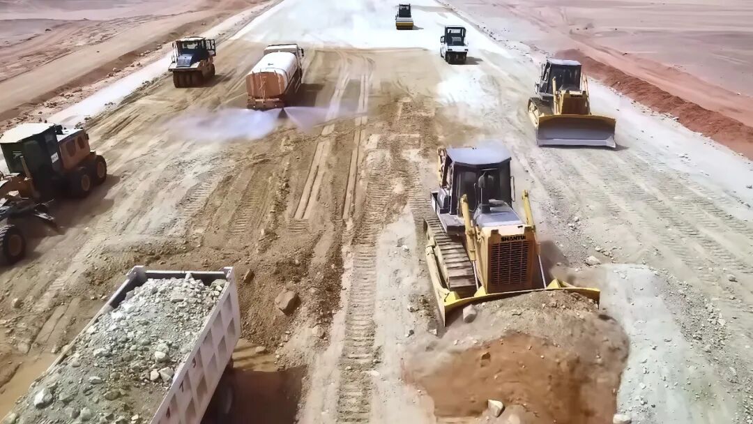 該鐵路是阿爾及利亞西部重要的礦業運輸生命線,其建設面臨前所未有的環境考驗。線路需穿越撒哈拉沙漠腹地,夏季地表溫度極高,且常年風沙肆虐,對施工設備是極其嚴峻的可靠性“大考”。在為期24個月的緊張建設中,8000多名中外建設者并肩奮戰,克服極端環境。山推SD32推土機作為土方作業的主力之一,始終活躍在施工前沿,憑借穩定的高出勤率與高效的作業能力,在沙海之中開路奠基,保障了工程節點的順利推進。