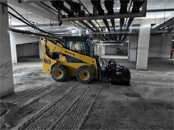 該小區(qū)地處市區(qū)核心板塊,周邊配套完善,地庫總面積約3萬平方米,整體為水泥硬化地面。為滿足后續(xù)自流平地坪施工的需求,地面必須經(jīng)過銑刨處理,確保材料與基礎(chǔ)面充分貼合。此前,客戶主要采用人工手推式銑刨鼓進行處理,效率低、粉塵大、勞動強度高,難以滿足項目對施工進度和質(zhì)量的一致性要求。